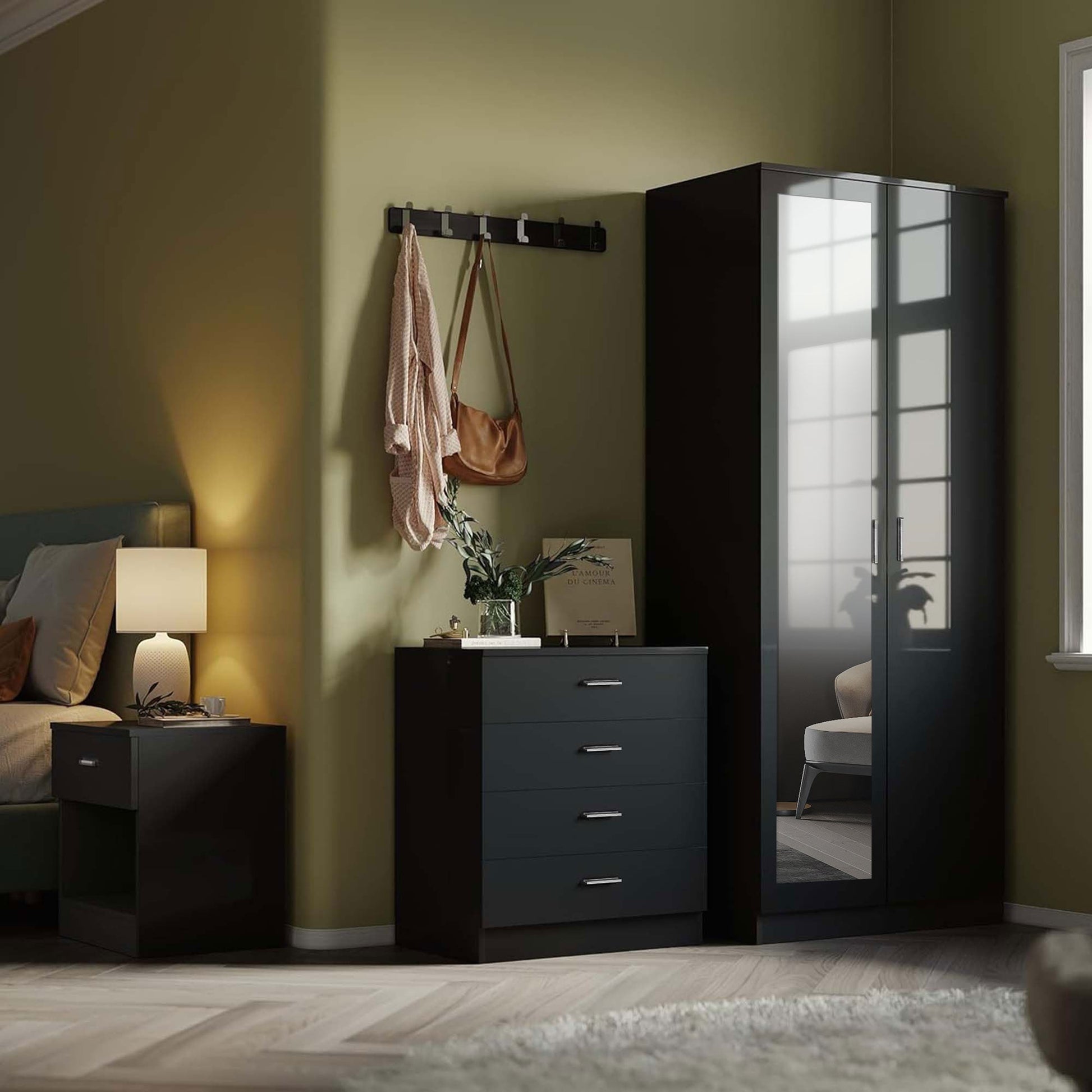 Elevate your bedroom with this sophisticated 3-piece high gloss furniture set in sleek black. The collection features a spacious two-door wardrobe (available with optional mirrored door), a practical four-drawer chest, and a coordinating bedside table. Each piece showcases premium high gloss finishes complemented by elegant chrome handles, creating a cohesive contemporary aesthetic. The minimalist design and clean lines offer versatile styling options while providing essential storage functionality. The wardrobe delivers ample hanging space, while the chest offers generous compartments for folded garments and accessories.