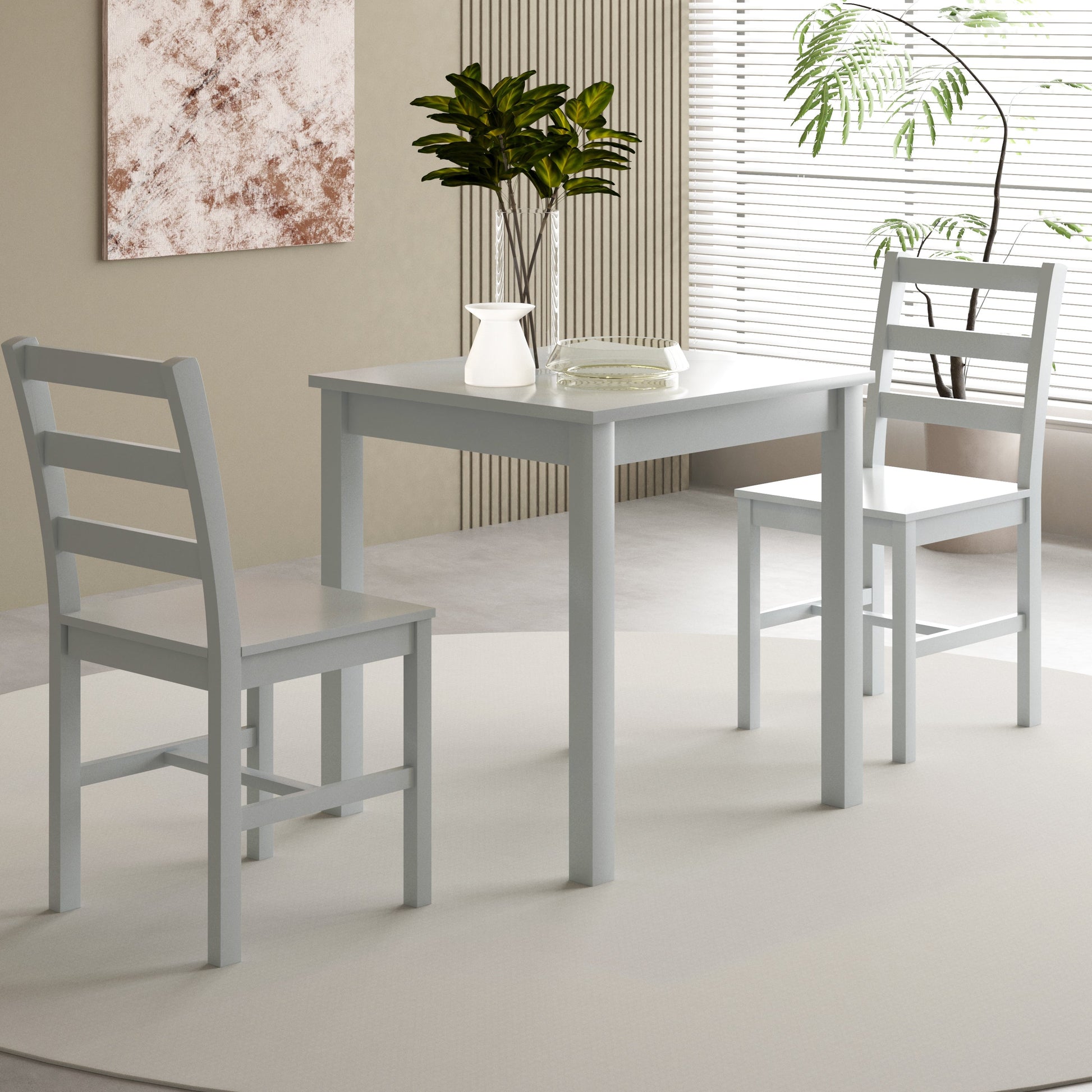 Craft beautiful memories and share delicious meals with your loved ones around this elegant and practical wooden dining set. With a durable wooden rectangular top and sturdy chairs featuring ladder-back designs and contoured seats, this set offers both style and comfort. Available in four neutral colours and two sizes, this timeless dining ensemble easily fits into any decor. Choose between a 2-chair or 4-chair set in white, grey, white with a natural top, or grey with a natural top. The product arrives flat-packed with all the necessary tools and instructions for easy home assembly.